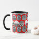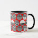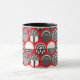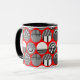 Cette tasse a un design géométrique des ovales avec différents motifs en gris dans chaque moitié sur un champ de rouge.