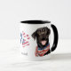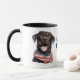 La caractéristique de cette tasse unique est l'aquarelle d'un chien noir Labrador Retriever portant un foulard américain. L'image est sur deux côtés de la tasse, avec une étoile et raye empreinte de patte et votre texte personnalisé entre eux.