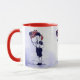 Une tasse patriotique à l'art vintage américain avec un garçon patriotique tenant le feu d'artifice des Fêtes rouges et un vieux drapeau américain restauré à partir d'une gravure ancienne.