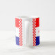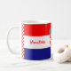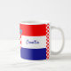 Tasse classique de 11 oz avec le drapeau croate avec le texte personnalisable "Hrvatska" (nom croate du pays) sur le côté gauche en écriture rouge et "Croatie" sur le côté droit de l'emblème et motif rouge et noir à damiers sur les deux bords verticaux.