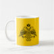 Drapeau de l'Eglise orthodoxe grecque. La conception du drapeau, parfois surnommé le "drapeau impérial byzantin", est considérée, à juste titre, comme la véritable bannière historique de l'Empire byzantin. L'aigle à deux têtes était historiquement utilisé comme emblème à la fin de la période byzantine (14ème-15ème siècles), mais rarement sur des drapeaux ; il était plutôt brodé sur des vêtements et des objets impériaux par les empereurs Palaiologos de l'Empire byzantin et les dirigeants Grand Komnenos de l'Empire de Trebizond, descendants de la famille impériale byzantine du même nom.