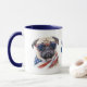 La particularité de cette tasse unique est l'aquarelle d'un chien Carlin enveloppé d'un drapeau américain et portant de grandes lunettes de soleil rouges. L'image est sur deux côtés de la tasse, avec une étoile et raye empreinte de patte et votre texte personnalisé entre eux.