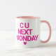 Bold Pink Text on White & Pink Coffee Cup.Commencez vos matins avec un sourire en utilisant cette tasse "C U Next Monday", conçue avec un bloc rose audacieux lettrage sur une tasse blanche propre avec poignée et intérieur rose assortis. Ce design sobre et pointu conviendra parfaitement à ceux qui apprécient l'humour avec un peu d'attitude. Grande comme un cadeau de gag, une tasse de café de bureau ou un pick-me personnel, cette tasse ajoute une déclaration audacieuse à tout rituel de caféine. Ce n’est pas pour les faibles de coeur, c’est pour les audacieux et sans excuses.