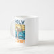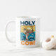 Une vache drôle sur une tasse avec un jeu de mot visuel. Utilisez "Personnalisez ce modèle" pour modifier le texte "SAINT VACHE !" et créer un élément unique et customisé. Un jeu de mots mettant en vedette une vache dramatique en robe, tenant un escroc de berger et un défilé religieux, parsemant les vagues avec un coup de soleil doré derrière.