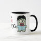 Cette tasse apportera un sourire. L'image est celle d'un zombie de dessin animé aux yeux fous et à la bouche qui goutte du sang. Le texte au centre en rouge et noir dit "Besoin de plus de café." L'image zombie est imprimée sur deux côtés. Mignonne !
