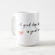 "Éclaircissez vos matins avec ce design de tasse stimulant! Avec l'expression "Une bonne journée commence avec une bonne humeur" aux côtés de coeurs jolies dessinés à la main, cette tasse est la façon parfaite de commencer votre journée avec positivité. Que vous sirotiez votre café du matin ou que vous buviez un thé, ce joyeux rappel vous donnera de l’humeur et vous donnera le ton pour une bonne journée. Un grand cadeau ou un pick-me personnel pour toute personne qui croit à bien commencer la journée!"