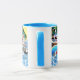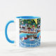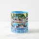 Une tasse blanche de bonne qualité avec une jante et une poignée bleu poudre et un collage en papier peint à la main de la conception d'un petit port avec bateaux de pêche et mouettes. Voir aussi carte de voeux, cadeaux et vêtements correspondants.