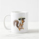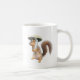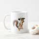 Un écureuil tient un champignon comme un parapluie sur cette mignonne tasse.