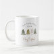 Une tasse à café simple et élégante, avec quatre pins de Noël aquarellés et un nom de famille personnalisé, parfait comme cadeau de Noël.