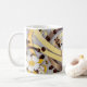 Cette tasse à café présente un design élégant et personnalisé, parfait pour les amateurs de café. Le design intègre une palette harmonieuse de tons crème, or et marron avec un élégant motif tourbillon. Fèves de café, fleurs blanches et jaunes délicates et touches décoratives de café rehaussent le thème cosy et aromatique. L'élément central comprend deux tasses à café, chacune personnalisable avec des initiales (comme "MW") pour une touche personnelle. Les rubans fluides et les teintes chaudes créent une esthétique sophistiquée mais accueillante, idéale pour le don ou l'usage personnel.
