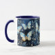 Cette tasse a un beau motif d'élégants papillons, de feuilles et de baies dans les tons or et bleu pastel.