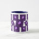 The coffee mug features fine art macro photography of a portrait of a blooming pink spring flower, highlighting beautiful details of the floral petals and sepals, on a purple background. The photograph represents the soft beauty of spring blossoms.