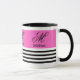 Un élégant minimaliste chic rayé noir et blanc présente une lettre calligraphique de style classique et dramatique. Avec le ruban rose vif pour customiser votre nom, que vous soyez en train de profiter d'un matin tranquille à la maison ou en train de brasser pendant une journée de travail buste, cette tasse est parfaite pour aider à rester chaud et concentré. Excellent cadeau pour vous-même ou un cadeau pour les amis et la famille ou ceux qui recherchent quelque chose d'unique.
