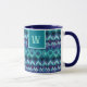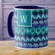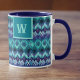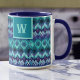 Cette conception est composée d'un motif tribal aux formes organiques et géométriques, comme les triangles et les flèches, en turquoise, vert, bleu et violet. En haut, vos initiales apparaissent sur le devant et en noir dans l'aqua contre un arrière - plan turquoise. Assurez-vous de taper votre initiale dans la zone Personnalisée pour customiser votre conception.