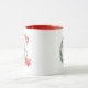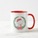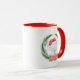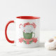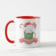 Ce joli design d'éléphant blanc présente un éléphant d'aquarelle portant un chapeau de Santa Peeking sorti d'une tasse verte de Noël. Un nom peut être ajouté en blanc sur une bannière de ruban rouge. Le dos a un éléphant qui regarde à travers une couronne.