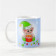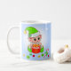 Elfe de Noël vert mignon moderne avec boîte cadeau, boules de Noël, sucre de canne et étoile sur Mug de Noël arrière - plan bleu clair. Le nom peut être personnalisé.