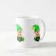 Elfe mignon avec un pot d'or et trèfle chanceux sur une tasse à café blanche.