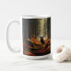 Un imposant élan de taureau trône fièrement dans une forêt automnale ensoleillée, entourée de grands arbres et d'un feuillage orange vif. Le cadre naturel serein reflète l'essence de la nature sauvage et de la tranquillité.