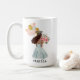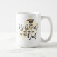 Cette tasse est décorée d'une peinture à l'aquarelle d'une fille à la peau foncée et aux cheveux noirs avec une robe bleue et une casquette de graduation tenant des ballons, des fleurs et son diplôme roulé. Vous pouvez ajouter un nom à l'avant. Le dessin du dos comporte la citation "Elle croyait qu'elle pouvait, alors elle l'a fait" en écriture et serif type sur la fausse parties scintillant d'or. Un chapeau de graduation et une moustiquaire au-dessus du devis complètent le design.