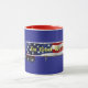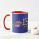 American Flag et En Dieu, nous faisons confiance à Patriotic Big Rig Tractor Trailer Mug. Avec l'oeuvre originale "Little (and Big) Red Trucks" de Rick Ellinger. Semi-camion et remorque détaillée avec le drapeau américain. "In God We Trust" a gravé la bande-annonce.