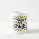 "Together We Smile" dans un vif gradient arc-en-ciel. Chaque mot se transforme en douceur d'une couleur à l'autre, créant un look gai et optimiste.L'image que vous avez téléchargée montre une tasse avec l'expression "ENSEMBLE NOUS SOURIONS" entourée de fleurs colorées et de feuilles. Cela pourrait être une idée de cadeau formidable ou un symbole de positivité et de travail d'équipe.