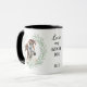 "LOVE MY BOXER DOG" declares this mug for the proud Boxer owner. Each side of the mug has a beautiful portrait of a brown and white Boxer framed by soft green watercolor eucalyptus leaves. Between the two images is the text, which may be easily customized, or even removed, by you, and your monogram or name.