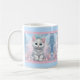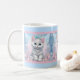 Un adorable chaton blanc princesse de fées avec bijoux, fleurs roses et ailes de fées sur un arrière - plan bleu étincelant.