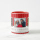 Famille personnalisée 3 Photo Collage de Noël Mug. Joyeux Noël et un texte personnalisé. Ajoutez trois photos. Personnalisez le texte comme vous le souhaitez ou supprimez-le. L'arrière - plan dispose d'un arrière - plan rouge à rayures blanches. Grand comme un cadeau de Noël ou une tasse de gardien pour vous-même.