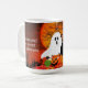 Cette tasse à café d'Halloween présente un collage d'un chat noir dans un cimetière effrayant et un fantôme. Chaque illustration utilisée dans ce design a été découpée dans une photographie puis réglée à la main en superposition. Utilisez cette tasse tout au long de la saison d'Halloween pour la vaisselle quotidienne ou pour une fête.