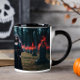 Femme gothique en feu de la Mug des cimetières. © Dark Heart Desires. Cette tasse à café gothique a une photo d'une femme gothique dans un cimetière avec feu tout autour.