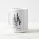 Cette tasse à café de style fermier festive et chaleureuse présente une silhouette de pinède peinte à la main sur un arrière - plan de bois de ferme faux blanc avec nom de famille et date.. Copyright Anastasia Surridge pour The Christmas Shop, tous droits réservés.