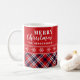 Festive tasse à café de Noël personnalisée avec un design élégant rouge, blanc et bleu marine. Le motif en plastique Tartan décore la partie inférieure de la tasse. Tapez votre nom de famille à l'aide du modèle pour créer un décor unique de conservation ou de cuisine de Noël.