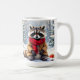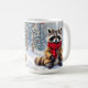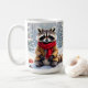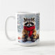 Super mignonne tasse de café de Noël qui a un aquarelle d'air, illustration d'un raton laveur festif assis dans une forêt capricieuse de neige pendant une journée d'hiver avec en toile de fond des pins décorés de vacances.