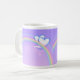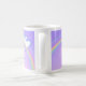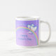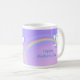 Un mug avec mon œuvre d'art numérique originale de deux cœurs blancs et bleus sur un arc-en-ciel dans un ciel de couleur mauve ou lilas. Le texte personnalisable dit "Joyeuse Fête des Mères".
