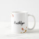 Un seul grand citrouille d'un côté de la tasse avec des feuilles d'automne qui tombent autour. L'expression "Feuilles d'automne et Citrouilles s'il vous plaît" est écrite à côté du citrouille dans une charmante police manuscrite, avec des petits détails de feuille accusant le texte.