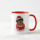 Mug de Noël avec l'illustration d'une mignonne fille afro-américaine souriante avec une coiffure afro, la fille porte un costume de Santa Clause avec un casquette rouge et tenant un cadeau ; dans un cercle rouge sur un arrière - plan rouge, avec un modèle texte modifiable pour votre nom ou message