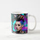 Femme punk rockeuse Mohawk avec mohawk coloré, tatouages et piercings et fond d'art fluide abstrait en noir, violet, vert et bleu.