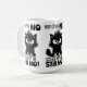 A funny, sarcastic black-and-white graphic design showcases a black cat with frazzled fur and a scowling expression. The black handwritten text says, "First of all, no. Second of all, still no!" Available on a wide variety of products, this design makes a perfect gift for cat lovers.