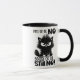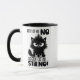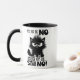 A funny, sarcastic black-and-white graphic design showcases a black cat with frazzled fur and a scowling expression. The black handwritten text says, "First of all, no. Second of all, still no!" Available on a wide variety of products, this design makes a perfect gift for cat lovers.