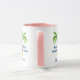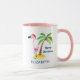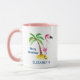 Tasse personnalisée avec une jolie illustration d'un flamant rose portant un chapeau de santa rouge. Posé sur un monticule de sable avec un palmier tropical derrière, parfait pour un Noël tropical.