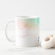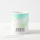 Une tasse avec une bordure abstraite le long du dessus avec des couleurs tourbillonnant vertes et bleues. Un design doux et estival. Une lumière croise la texture derrière l'image.
