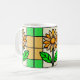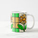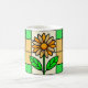 un vitrail illustrant une marguerite jaune et blanche aux feuilles verts.