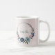 Magnifique mug de café botanique présentant des fleurs roses, bleu poussiéreux et bleu marine avec des feuilles vertes.
