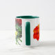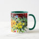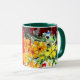 Une tasse blanche avec une jante et une poignée de Hunter Green et une aquarelle entièrement recouverte de fleurs murales multicolores.