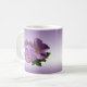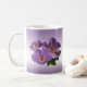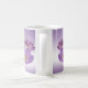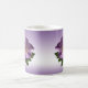 Cette jolie tasse est décorée de fleurs de géranium de Cranesbill violet magenta, chacune avec un beau centre jaune doré, et feuillage vert. Ils sont situés sur un arrière - plan de dégradé de lilas pâle.