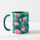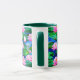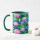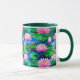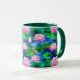 Tasse à café dans un motif de fleurs de lotus roses en fleurs et de caleçons verts luxuriants flottant sur une surface d'eau bleu richement texturée, dans des tons de rose et vert émeraude