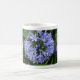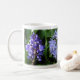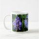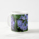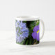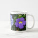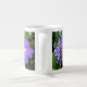 Trois photographies en gros plan sont combinées pour entourer votre tasse avec les fleurs bleues et pourpres. Cette conception semble également grande avec l'option à deux tons jaune !