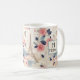 Une tasse avec une belle motif à thème française. Jolies fleurs et une tour Eiffel et papillons. Les couleurs comprennent le rose, le bleu, la pêche et la crème.