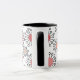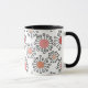 Cette tasse présente un design moderne du milieu du siècle avec des fleurs en cercles dans les tons rose, canneberge et beige et lignes noires.