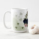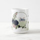 Magnifique mug café botanique aux fleurs roses et bleu marine avec feuilles vertes romantiques.